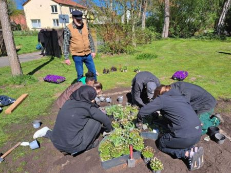 Am 19. April 2023 ging es an die praktische Umsetzung auf dem Westfriedhof in Paderborn. Als Fläche wurde der Bereich mit polnisch und russischen Kriegsgräbern ausgewählt. Das Friedhofsamt hatte die Rasenfläche abgeschält, auf 20cm Tiefe ausgekoffert und sich um den Einkauf der Pflanzen gekümmert. Die ausgekofferte Fläche wurde von den Schülerinnen und Schülern mit Substrat aufgefüllt und gleichmäßig verteilt. Dann wurde die Schablone mit der Friedenstaube mit Markierungsspray auf die Fläche übertragen. Ein Teil der Klasse kümmerte sich um die Umrandung, legte dazu die Natursteine in Form der Wolke aus und schlug die Steine mit einem Gummihammer in den Boden, sodass eine höhengleiche Kante für den Rasenmäher entstand. In der Zeit formte der andere Teil der Klasse mit ca.20cm hohen Stahlbändern die Umrandung der Taube. Anschließend wurde die Stahlumrandung ca.10cm tief in den Boden geschlagen und mit weiß blühenden Bodendeckern bepflanzt. Eine Stecklampe diente als Auge. Danach wurden außen die blauen Bodendecker bepflanzt. Nach dem Angießen war das Werk vollendet und die Pflanzen wachsen hoffentlich gut an.